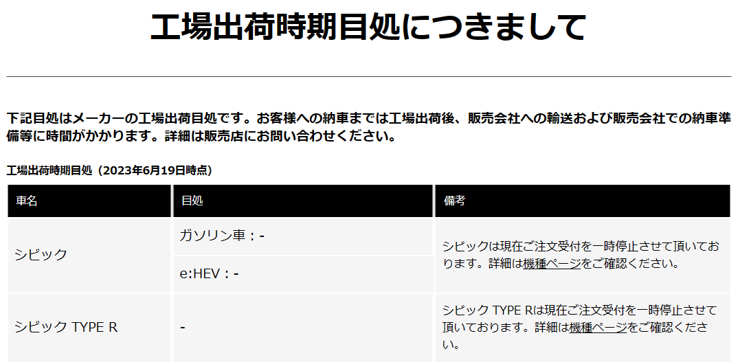 6/19にホンダ公式の生産納期目安が更新されました。