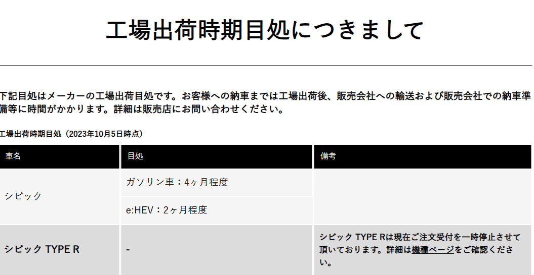 なんとシビックタイプRは納期目安が